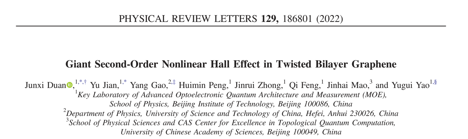 Junxi Duan*,†, Yu Jian†, Yang Gao*, Huimin Peng, Jinrui Zhong, Qi Feng, Jinhai Mao, and Yugui Yao*,“Giant Second-Order Nonlinear Hall Effect in Twisted Bilayer Graphene”,Phys. Rev. Lett. 129, 186801 (2022) (†co-first authors,*corresponding authors)