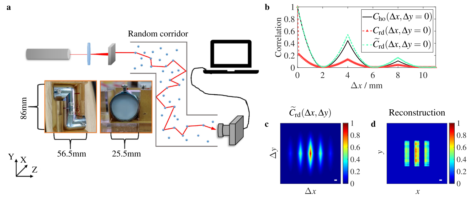 来源: 作者: 发布时间:2022-10-14Relying on its ability to reconstruct an object hidden beyond the direct line of sight of a camera, computational imaging has recently attracted more and more interest. The potential application of computational imaging ranges from robotic vision, autonomous driving, disaster relief, to medical imaging. In the typical imaging scene widely studied previously, non-line-of-sight imaging always requires a relay surface located in the field of view of both the hidden object and the camera. Non-line-of-sight methods, such as back-projection, light-cone transform, phasor field, computational periscope, and spatial coherence analysis, are able to reconstruct the images of objects obscured by corners, by using the spatiotemporal information of diffuse light reflected from the relay surface. New techniques greatly improve the efficiency, economy, minimum resolution, and maximum working distance of non-line-of-sight imaging. On the other hand, methods such as speckle correlations, wavefront-shaping, and speckle deconvolution are capable of computational imaging through random media and around corners. In spite of recent advances, challenging but important computational imaging in another representative complex environment, a ‘random corridor’ has received little attentions. The random corridor is a tortuous corridor filled with random media, which often exists in rescue scenes such as dusty mines, smoke-filled ventilation ducts, and building corridors. Imaging rescue targets obscured by a random corridor can greatly improve rescue efficiency and protect rescue crews.