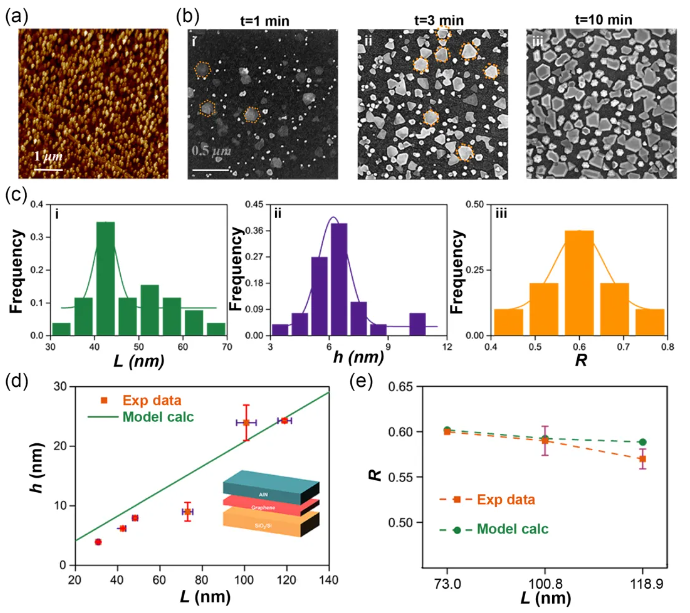 To unravel this mysterious growth mechanism, the research team, taking the growth of aluminum nitride (AlN) thin films on graphene as an example, utilized multi-scale theoretical calculations and continuous medium model derivations to systematically study the growth dynamics of AlN thin films in-plane (Fig. 2) and out-of-plane directions (Fig. 3). Interestingly, they found a new type of bonding at the interface between AlN and graphene, namely, the hybrid van der Waals interaction. This unique bonding mode allows the thin film growth to exhibit a new paradigm that is significantly different from traditional models, which is named the HVE (Hybrid van der Waals Epitaxy) model. Under the HVE model, the growth of materials in the plane and out of the plane is more strongly coupled together and satisfies certain physical constraints, which are also influenced by the interface interactions. To verify the reliability of this new growth model proposed by theory, Prof. Xuelin Yang from Peking University and others conducted experimental validation, preliminarily confirming the reliability of this growth mode (Fig. 4).