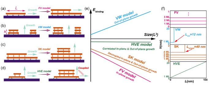 The study of novel physical phenomena in condensed matter physics and the fabrication of electronic devices in information science both greatly rely on the preparation of high-quality thin-film materials. Therefore, how to epitaxially grow high-quality thin-film materials on substrates is a long-standing focal issue in numerous research fields such as condensed matter physics, materials science, and surface chemistry. Based on nearly a century of research, people have gradually summarized three universal thin-film growth models, known as the FV (Frank-van der Merew), VW (Volmer-Weber), and SK (Stranski-Krastanow) models. The FV model describes a in-plane growth mode. In contrast, the VW model describes a out-of-plane growth mode. The SK model is a growth mode that lies between FV and VW. In these three known growth models, in-plane and out-of-plane growth are decoupled, and they can describe almost all known epitaxial growth processes of thin-film materials on substrates (Fig. 1). Recently, it has been discovered that high-quality non-van der Waals nitride semiconductor thin films can be grown on two-dimensional van der Waals substrates. This groundbreaking discovery not only opens up a new semiconductor growth mode but also sparks intense debate on its growth mechanism.
