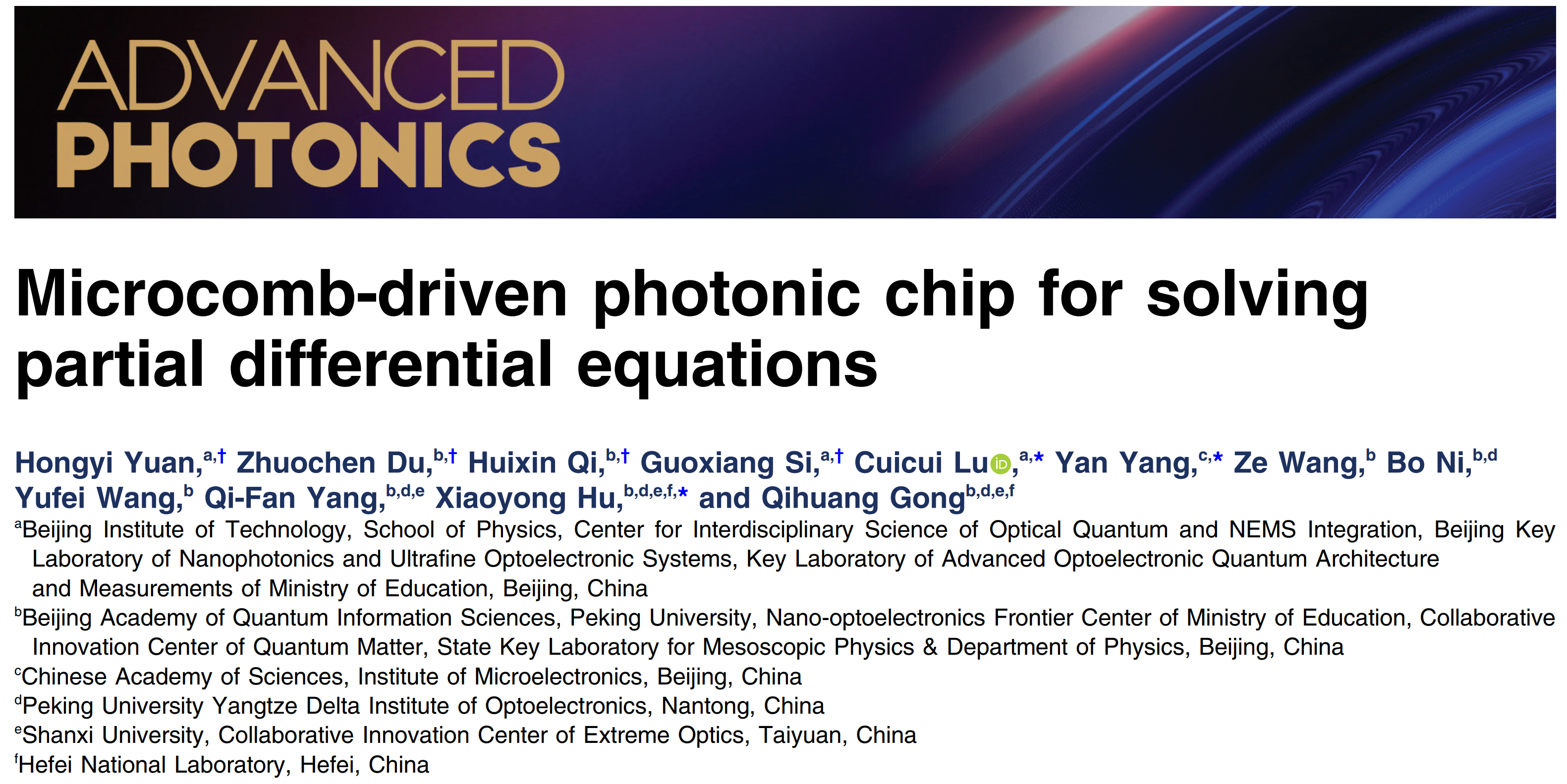 With the development of the big data era, the need for computation power is dramatically growing, especially for solving partial differential equations (PDEs), because PDEs are often used to describe complex systems and phenomena in both science and engineering. However, it is still a great challenge for on-chip photonic solving of time-evolving PDEs because of the difficulties in big coefficient matrix photonic computing, high accuracy, and error accumulation. We overcome these challenges by realizing a microcomb-driven photonic chip and introducing time-division multiplexing and matrix partition techniques into PDE photonic solving, which can solve PDEs with a large coefficient matrix on a photonic chip with a limited size. Time-evolving PDEs, including the heat equation with the first order of time derivative, the wave equation with the second order of time derivative, and the nonlinear Burgers equation, are solved with an accuracy of up to 97%. Furthermore, the parallel solving of the Poisson equation and Laplace’s equation is demonstrated experimentally on a single chip, with an accuracy of 95.9% and 95.8%, respectively. We offer a powerful photonic platform for solving PDEs, which takes a step forward in the application of photonic chips in mathematical problems and will promote the development of on-chip photonic computing. |