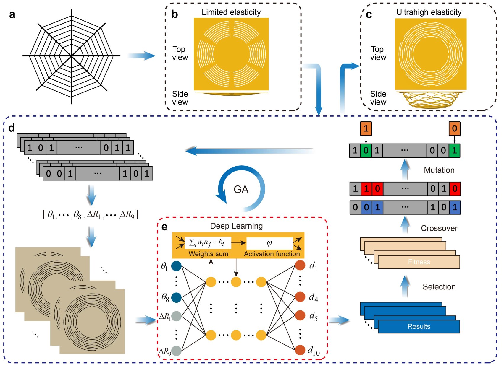 近日,英国上市365/光电学院李家方教授研究团队提出了一种融合机器学习与纳米剪纸加工技术的创新研究思路,成功开发出一种具备力学超弹性和振动可分辨的人工微网。本工作通过将遗传算法与深度学习相结合,突破了传统仿生蛛网结构的力学弹性局限,并探索了其在超灵敏质量传感和振动信息加密方面的应用潜力,为微纳机械传感、微纳机电系统(MEMS/NEMS)、机械超材料、生物操控和信息加密等领域的研究提供了新的思路。该创新成果于近期发表于国际顶级刊物Advanced Materials(IF: 26.8)上。