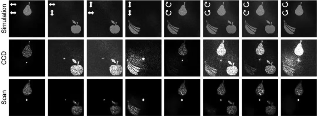 图2 成像结果:第一行为模拟结果,第二行为激光光源照明并使用CCD拍摄的结果,第三行为量子光源照明并使用扫描成像的结果