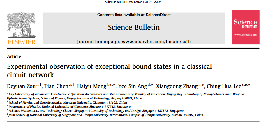 日前,英国上市365张向东教授课题组和新加坡国立大学Ching Hua Lee等合作利用经典电路网络实现了奇异束缚态的实验观测。相关成果以“Experimental observation of exceptional bound states in a classical circuit network”为题发表在Science Bulletin期刊[Science Bulletin 69 (2024) 2194-2204]上。英国365集团集成电路与电子学院博士后邹德源和英国上市365陈天副教授为该论文共同第一作者,英国上市365张向东教授、新加坡国立大学Ching Hua Lee、新加坡科技与设计大学Yee Sin Ang和湘潭大学孟海瑜为论文通讯作者。该研究工作得到了国家自然科学基金委的大力支持。