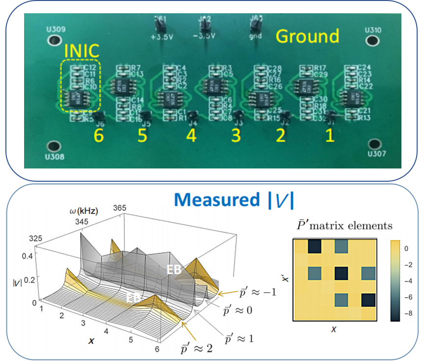 首先,研究人员基于量子薛定谔方程与电路基尔霍夫方程数学形式上的一致性,将奇异束缚态的晶格模型引入到电路模型中。他们的方案示意图如图1所示。该电路包含6个节点(标记1-6),每个节点间通过电容和负阻抗转换器(INIC)连接。INIC的具体结构如右上侧虚线框所示,它提供了电路中的非互易耦合连接。另外,每个节点都应连接相应的接地元件以保证在位能。这样的一个电路网络能够与量子晶格模型之间存在良好的对应关系。通过输入电压并测量共振频率分布,研究人员就可以等效得到奇异束缚态的本征值和本征态等信息。