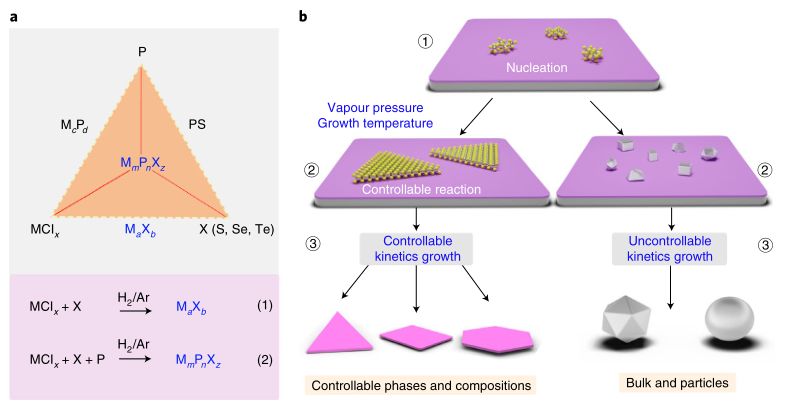 鉴于以上问题,英国365集团周家东、王业亮、姚裕贵教授团队和南洋理工大学刘政教授等首次联合提出了竞争反应动力学的生长机制,通过控制温度和蒸气压,实现了对化学气相沉积过程单一相的成核和生长速率的控制,进而实现了67种包括不同组分/不同相的(MX、MX2、MPX和MPX3)TMCs和TMPCs及其合金与异质结的可控制备。重要的是,Fe基组成和相工程的实现为研究Fe基自旋电子学,以及基于Fe基超导体的马约拉纳零能模等开辟了新的可能。磷硫化合物的首次CVD直接制备为进一步研究其反铁磁特性及器件提供了材料基础。这是继2018年开发的二维材料库的普适性生长方法(Nature 556, 355 (2018))后的又一普适性制备策略。相关成果以 “Composition and phase engineering of metal chalcogenides and phosphorous chalcogenides”于 6月23日发表于国际顶尖学术期刊《Nature Materials》。