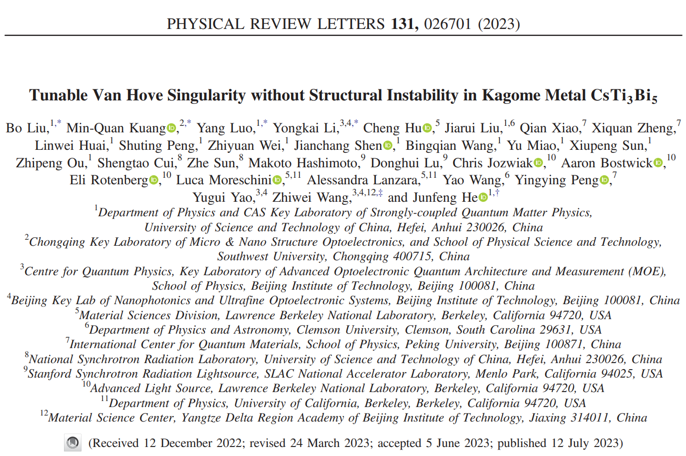 最近,北理工英国上市365王秩伟特别研究员、姚裕贵教授团队,与中国科技大学何俊峰教授、西南大学匡泯泉副教授等团队合作在新型笼目晶格材料CsTi3Bi5中取得进展。他们发现新型准二维笼目材料CsTi3Bi5具有CsV3Sb5相同的结构,是研究电子相关效应、拓扑物态和非常规超导电性等量子现象的一个良好平台。