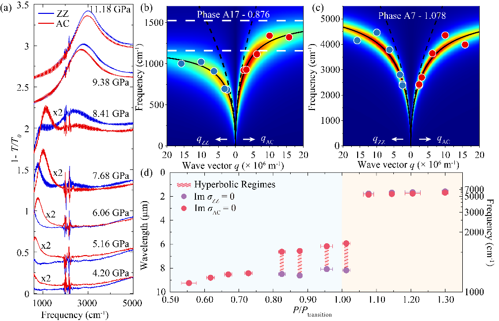 为在远场条件下激发并追踪等离激元共振响应,研究团队在BP薄膜中制备了沿armchair(AC)与zigzag(ZZ)晶轴取向一致的方形阵列结构。图2显示,在低压A17相中, AC与ZZ方向的等离激元共振峰位存在明显差异,体现出强烈的面内各向异性,并随压力升高连续蓝移;跨越A17-A7结构相变后,共振频率出现突跃,同时两方向峰位逐渐趋于一致,表明进入A7相后面内各向异性显著减弱。通过调控等离激元波矢,研究团队将共振频率的可调范围显著拓展,实现了从214 cm-1到4751 cm-1的宽频调谐,并伴随吸收强度及线二色性在典型频率处的明显变化。为揭示双曲响应的形成与演化机制,团队基于等离激元色散,以电导率虚部异号(ImσZZ · ImσAC < 0)作为双曲判据,确定了压力调控下的双曲区间。结果表明,BP等离激元的面内双曲区间在A17相内随压力持续蓝移,而进入A7相后双曲区间发生坍塌。