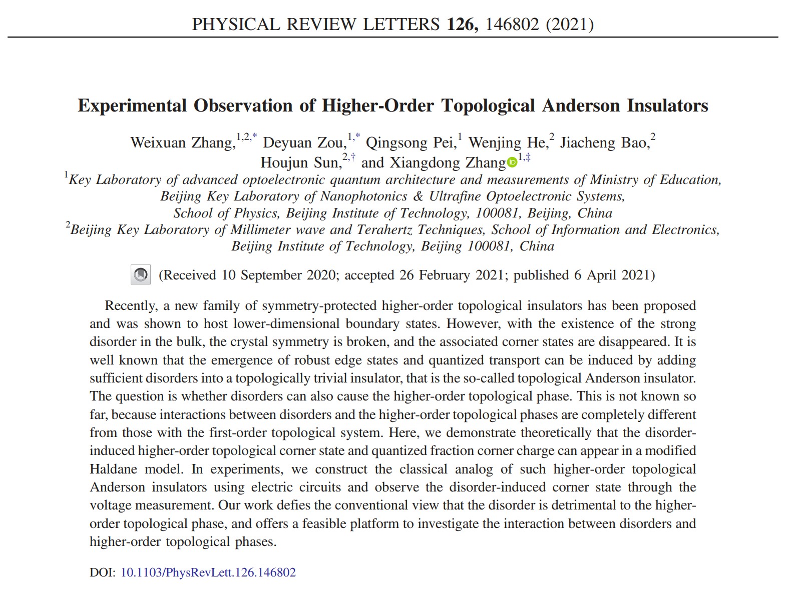 一般来说,强的无序效应会使拓扑系统的能隙闭合,从而破坏拓扑相的存在。与该传统的认识不同,2009年,来自香港大学的沈顺清课题组理论证明无序可以诱导拓扑态的形成[Phys. Rev. Lett. 102, 136806 (2009)],并为其取名为安德森拓扑绝缘体。随后,众多课题组利用不同的系统对安德森拓扑绝缘体进行了实验验证。近期,随着对高阶拓扑绝缘体研究的深入,一个重要的问题是:高阶安德森拓扑绝缘体是否存在;如果存在,如何对其进行实验验证。