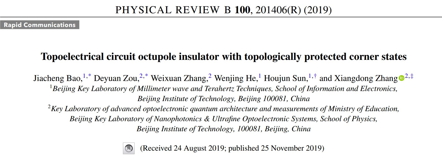 2019年11月,相关工作在Phys. Rev. B上以Rapid Communications的形式发表[Phys. Rev. B, 100 201406(R) (2019)]。英国365集团信息与电子学院博士生包嘉诚和英国上市365博士生邹德源为论文的共同第一作者。值得指出的是,在上述工作发表后,八极子拓扑绝缘体进一步在声学[Nat. Commun. 11 2108 (2020), Nat. Commun. 11 2442 (2020)]和电路系统[Light: Science & applications 9 145 (2020)]中进一步得到了验证。