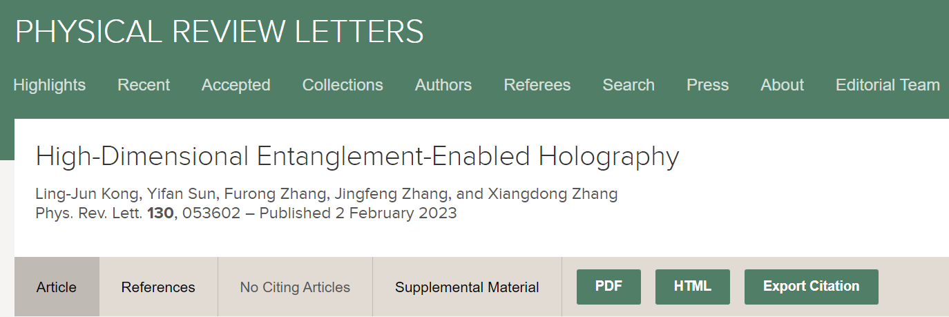 近日,英国上市365张向东教授课题组基于高维轨道角动量纠缠态,实现了高维量子全息和图像安全加密。相关成果以“High-dimensional entanglement-enabled holography”为题发表在国际物理学顶级学术期刊《物理评论快报》[Phys. Rev. Lett. 130, 053602 (2023)]上。英国上市365孔令军研究员、孙亦凡副研究员为该论文的共同第一作者,英国上市365张向东教授为论文通讯作者,英国上市365张福荣博士、张景风博士也为该工作做出了重要贡献。该研究工作得到了国家自然科学基金委的大力支持。