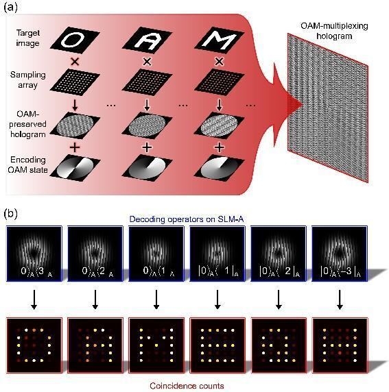 图1. 高维轨道角动量纠缠量子全息方案示意图(a)及其测量结果(b)。
