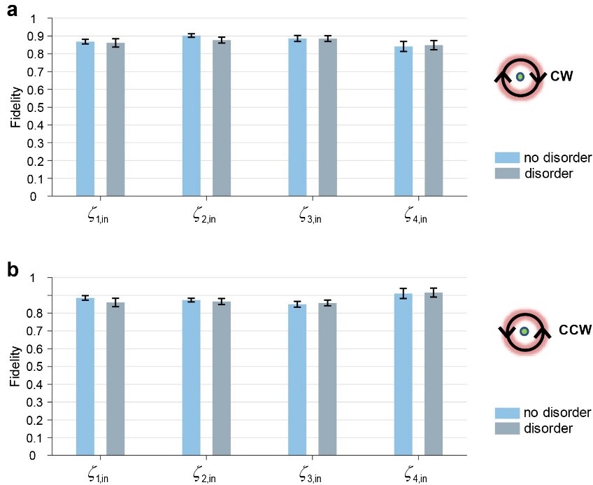 。图 5 显示了十组扰动的平均结果。蓝色柱子代表着没有无序的情况下,输出态与纠缠态之间的保真度,而灰色柱子代表有无序扰动时输出态的保真度。图 5a 显示了顺时针环绕奇异点的情况。可以看出,对于四种不同的输入贝尔态,有扰动时的保真度与没有扰动时相比变化不大,且都保持在0.8 以上。图 5b 中逆时针环绕奇异点时也有类似的结果。这说明纠缠态的手性开关确实对路径参数的无序扰动表现出了鲁棒性。