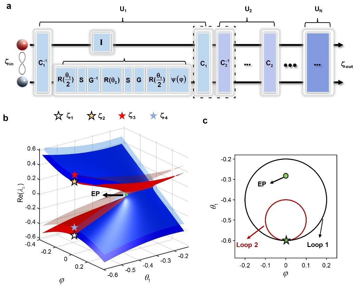 在以往的许多研究中,奇异点的动态环绕是用哈密顿量算符来描述的。在该工作中,研究团队提供了另一种描述此类问题的方法,即利用非厄米量子行走演化算符。如图 1a 所示,作为输入态