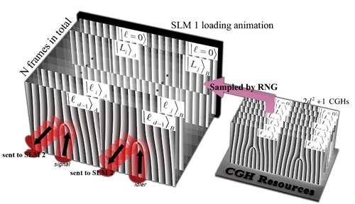 光的轨道角动量自由度由于其天然的高维属性,自发现起就被广泛应用于各类高维系统的构建中。在实验中通过光的参量下转换过程产生了轨道角动量光的最大纠缠态 (图1),进而通过一系列测量观测到了高维量子steering效应。图2展示的是测量结果。用加载动图的方式,定量的引入了一个可控的各向同性噪声(图3),并验证了高维steering效应中的噪声抑制现象(图4)。