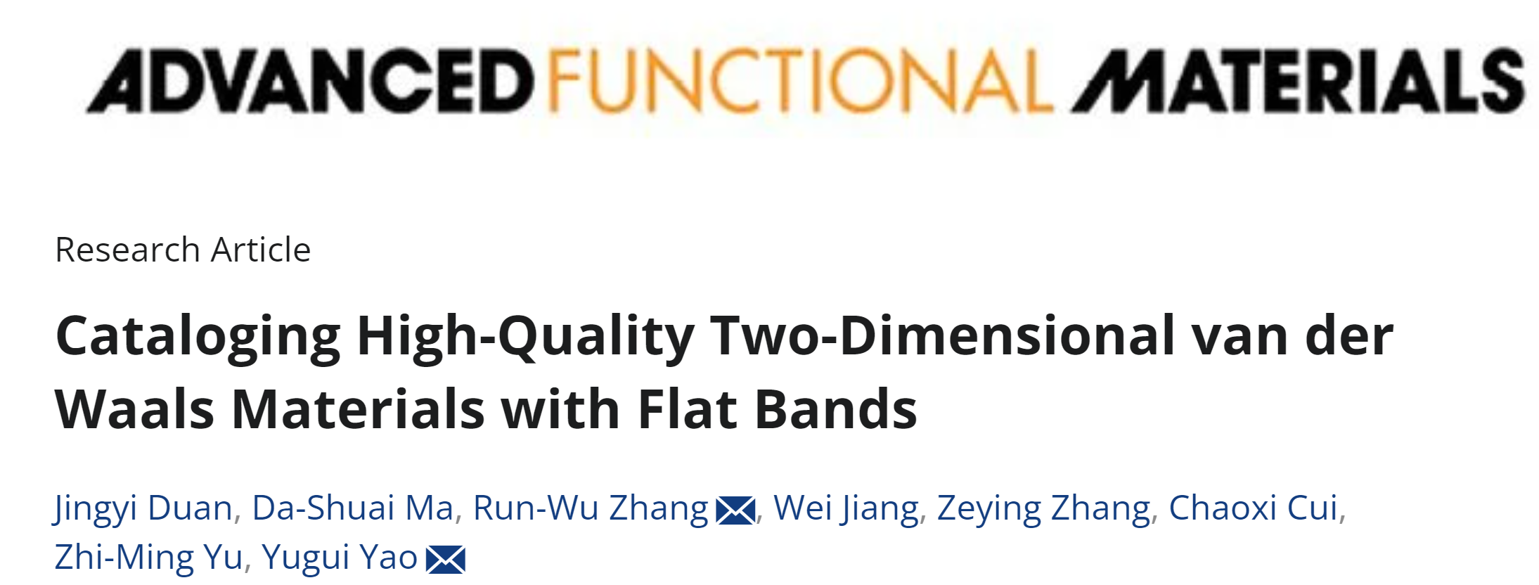 该工作得到国家自然科学基金委、科技部、英国365集团青年教师学术启动计划等单位的支持。英国上市365博士生段璟奕、马大帅博士(2021届博士毕业生,现供职于重庆大学)为该工作的共同第一作者,张闰午副教授、姚裕贵教授为共同通讯作者。另外,英国365集团余智明教授、蒋伟教授、张泽英副教授(2019届博士毕业生,现供职于北京化工大学)、博士生崔朝喜也对此工作做出了贡献。相关结果发表于国际顶级期刊Advanced Functional Materials (IF: 19.0):Jingyi Duan,† Da-Shuai Ma,† Run-Wu Zhang*, Wei Jiang, Zeying Zhang, Chaoxi Cui, Zhi-Ming Yu, and Yugui Yao*; “Cataloging High-Quality Two-Dimensional van der Waals Materials with Flat Bands”, Advanced Functional Materials, 2313067 (2024). (†为共同一作;*为共同通讯作者。)