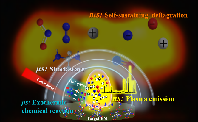 测试系统构建:自主搭建了小药量含能材料性能测试物理系统,集成了微区超快时间分辨光谱和高速动态流场显微成像系统。开展了覆盖纳秒到毫秒超快时间尺度,微米到厘米的激光诱导反应区微介观尺度的激光诱导跨尺度微爆过程全面探测,有效获得微区爆轰后时间分辨特征原子、分子、离子光谱、激光加载动态图像、微爆燃过程等多维度光学信息。