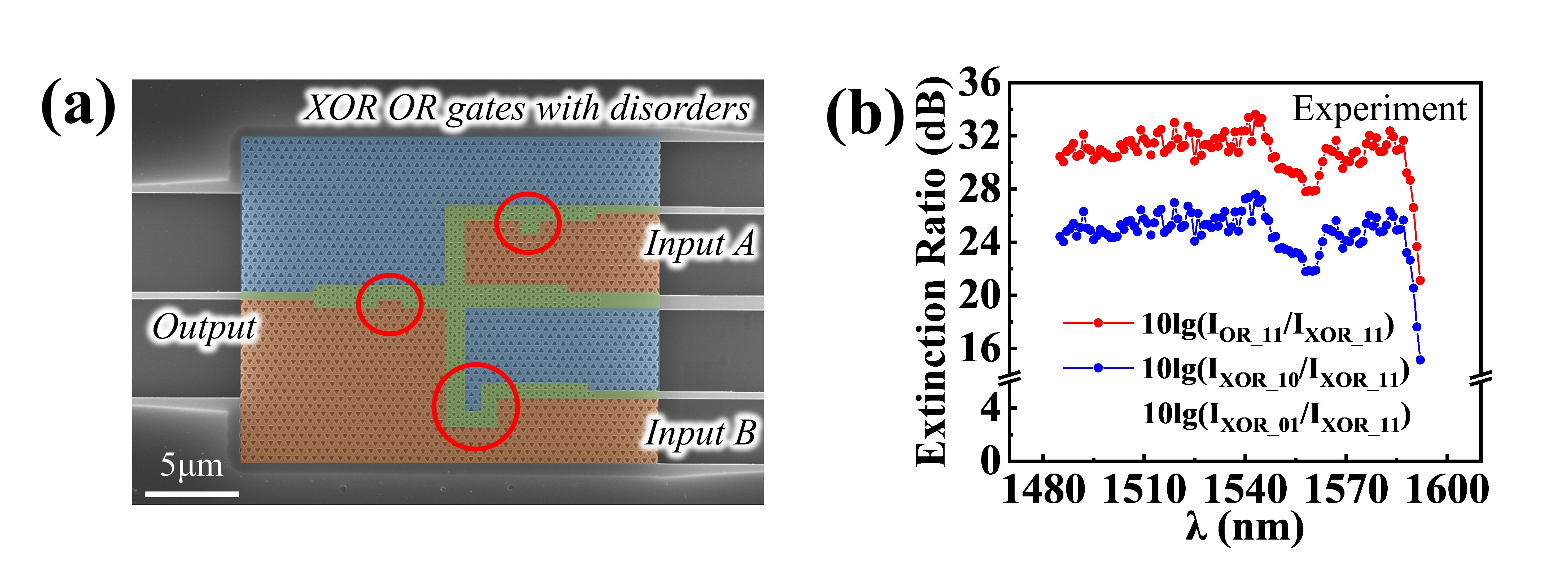 为了进一步实验证明所制备逻辑器件的鲁棒性,研究人员制备了具有三种缺陷的逻辑单元(XOR和OR门),如图5a的SEM图像所示。三个红色圆圈标记了三种不同类型的缺陷。实验结果(图5b)表明,这些器件在具有无序扰动的情况下依旧可以保持很高的消光比。