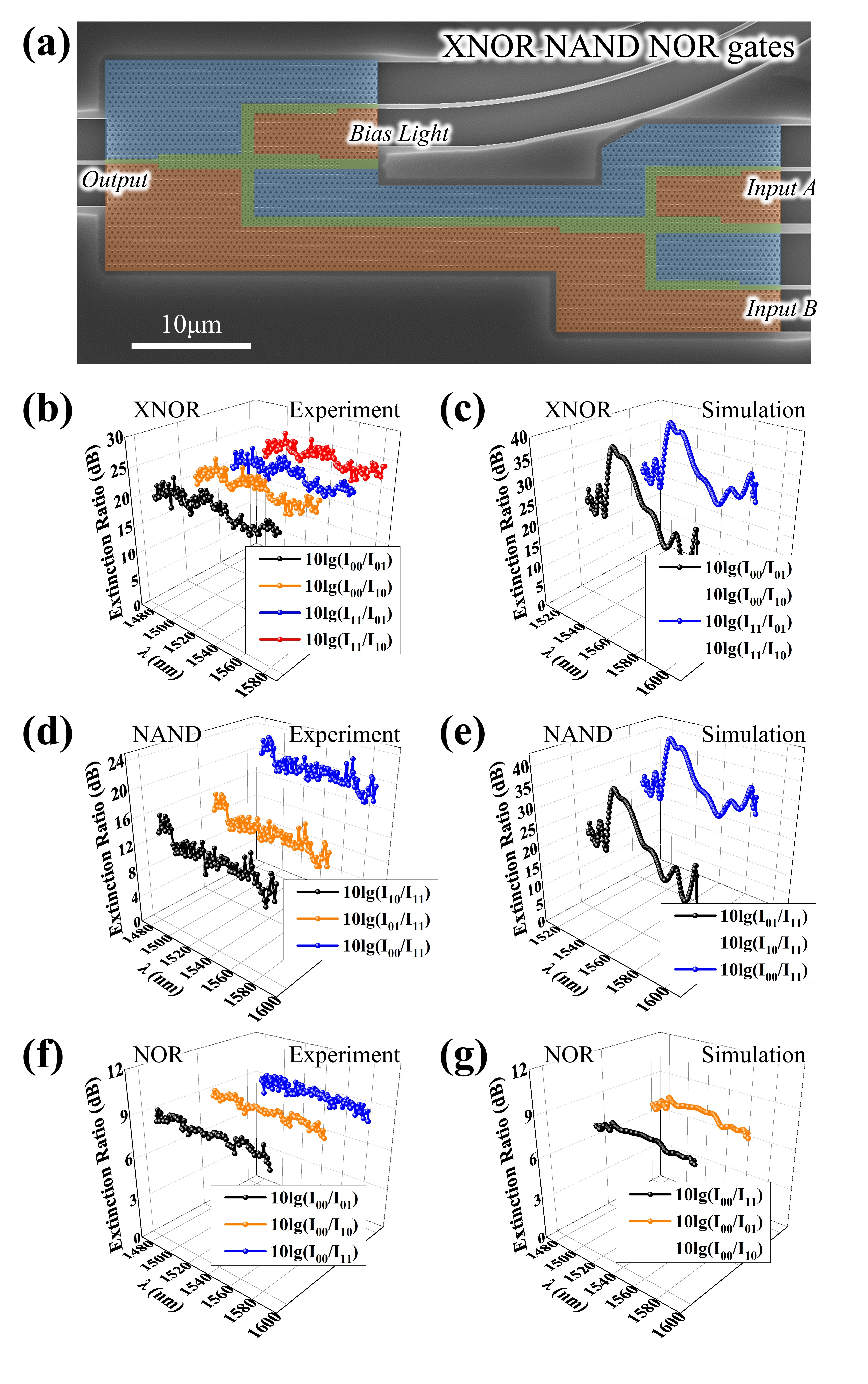 倍。当其中一个输入信号(输入A和输入B)开启时,输出端口发生干涉相消现象,输出信号为0。对于其他输入状态(输入信号都开启或关闭),输出幅度不为零,对应逻辑输出信号为1。消光比的实验和模拟结果分别如图3b和3c所示。实验结果表明,在1480-1580 nm的通信频段内,工作带宽约为100 nm (ER>20 dB),最大消光比达到25.72 dB。理论和实验结果均表明,XNOR门具有良好的效率。使用同样的方式,研究人员分别实现了NAND(偏置光的振幅是输入A(B)的2倍), NOR(偏置光的振幅为输入A(B)处振幅的0.75