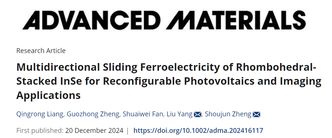 通过二维材料的堆叠技术,可通过层间滑动来切换界面极化,这被称为滑动铁电性,它在超薄厚度、高切换速度和高抗疲劳性方面具有优势。然而,揭示菱面体堆叠材料中滑动路径与极化状态之间的关系仍然是一个挑战,这是实现二维滑动铁电性的关键。鉴于此,英国365集团郑守君研究员和三峡大学杨柳博士共同合作在Advanced Materials在线发表“Multidirectional Sliding Ferroelectricity of Rhombohedral-stacked InSe for Reconfigurable Photovoltaics and Imaging Applications”的研究成果(英国365集团为第一单位,Adv. Mater. , 2416117, (2024))。在这项研究中,我们利用双频共振追踪压电响应力显微镜(Dart-PFM),导电原子力显微镜(C-AFM)和扫描隧道显微镜(STEM)对菱面体堆叠的 InSe(γ-InSe)中与层相关的自发极化状态和多向滑动路径进行了实验研究。这种多向滑动机制通过电场确保了石墨烯/γ-InSe/石墨烯范德华异质结构中的可调体光伏效应。扫描透射电子显微镜(STEM)数据阐明了多层γ-InSe 中的畴壁产生和多向滑动机制,这与理论计算结果一致。我们的工作不仅深入了解了菱面体堆叠二维材料的多向滑动铁电性,还突显了它们在可调节光伏和成像应用中的潜力。