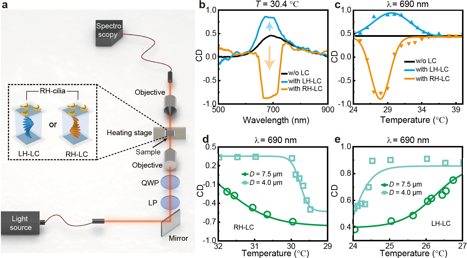 针对上述挑战,合作团队提出了一种基于双手性复合结构的全新调控策略,通过纳米剪纸和分子自组装技术,构造了手性纤毛型纳米结构与手性液晶相结合的集成器件,在热场调控下实现了圆二色性的放大、消除与反转。如图1所示,研究团队通过搭建手性纳米纤毛结构与手性胆甾相液晶的 “双手性平台”,借助胆甾相液晶布拉格反射区边缘对温度呈现出的动态响应特性,促使集成器件能够在不同温度条件下,针对圆偏振光展现出差异化的选择性响应。基于此,分别通过集成相同结构手性或相反结构手性,成功突破了传统手性结构相对固定且难以反转的局限,实现了集成器件在可见光波段的宽谱、动态且连续的手性响应调控(图2)。同时,提出的双手性平台基于纳米剪纸与液晶自组装制造技术,能够在纳米级像素尺寸下实现手性光学响应,为微纳光场调控提供了新范式。