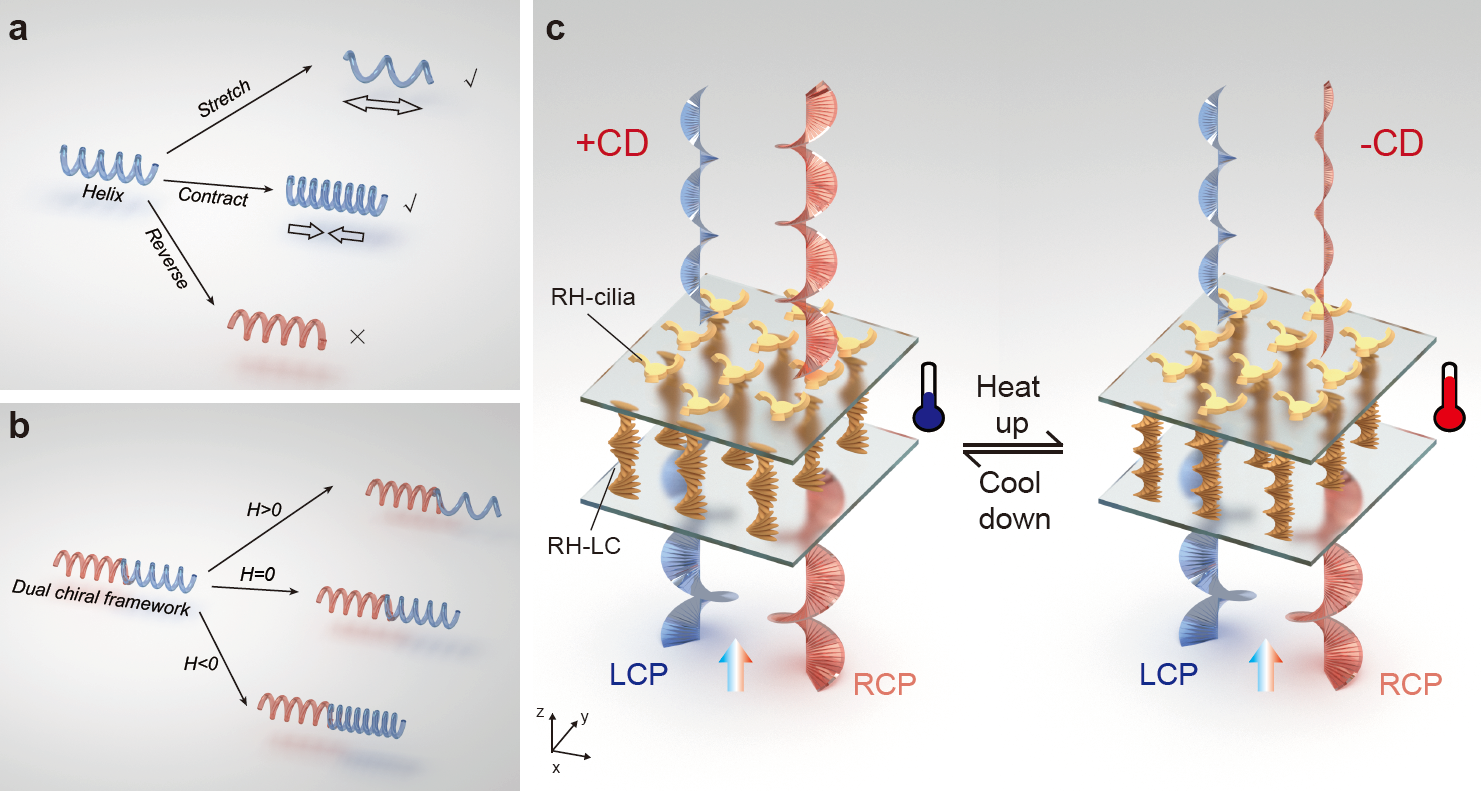 与天然手性分子相比,人工手性光子结构凭借更强烈的圆二色性(Circular Dichroism, CD),展现出更优异的光学调控能力。然而,当前大多数手性光子结构在实际应用中仍面临两个重要挑战:其一,这些结构的光学特性一旦制备完成即被固化,缺乏对外界环境变化的动态响应能力;其二,现有结构的手性响应往往呈现单向不可逆性,难以实现手性极性的主动调控与快速切换。这些问题制约了手性光子结构在光学加密、可调显示、动态传感等领域的应用拓展。
