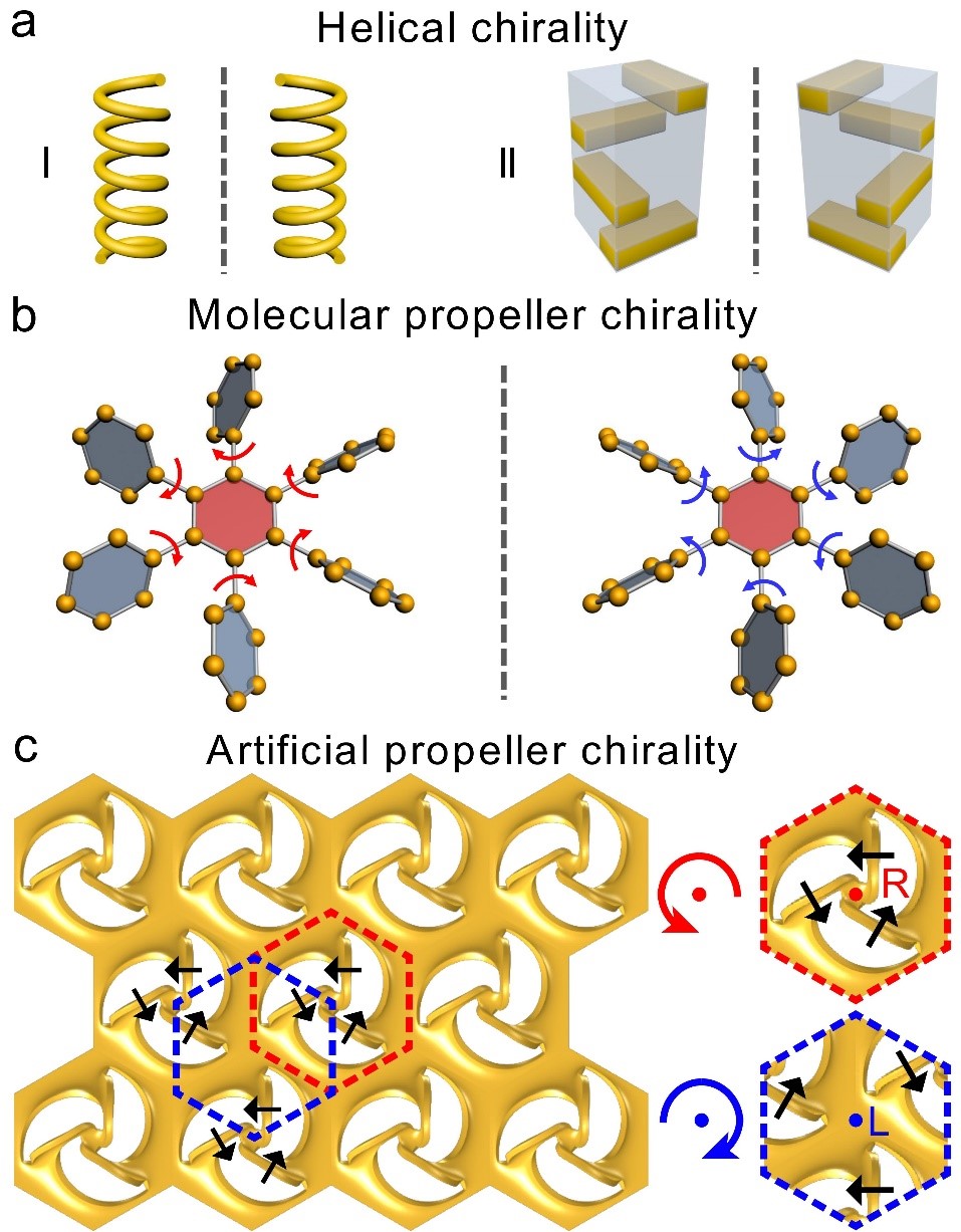 在之前的研究中,研究者主要利用具有明确旋向的螺旋几何构型来增强光和物质的手性相互作用。然而,这类构型的光学手性响应要实现反转,必须对其进行镜面对称操作,使结构发生巨大的改变。近年来,一种独特的螺旋桨状几何构型在分子领域引起了极大的关注,通过轻微地翻转“分子叶片”就可以反转其光学手性响应。然而,这种立体旋桨手性的研究仅仅局限于分子领域,在微纳光子学领域面临制备方法上的挑战。
