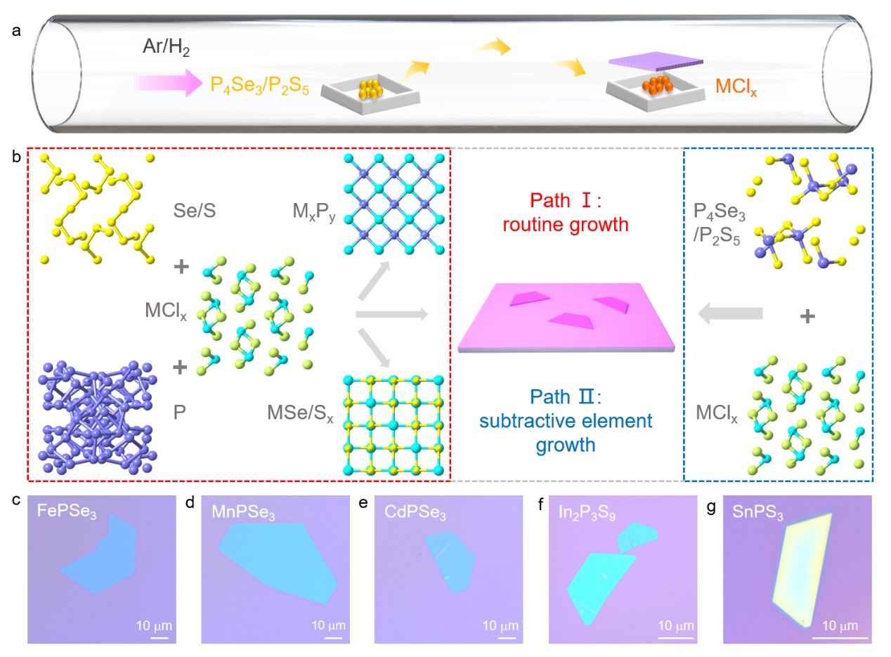 过渡金属磷硫化合物(TMPCs)是一大类包含三种及以上元素的二维层状材料,通常具有类似CdCl2晶体的准六方结构,由于独特的电子结构和优异的光学、电子、光电、磁性和催化性能而引起了广泛的研究兴趣。然而,大多数关于二维TMPCs的研究主要通过液相剥离或机械剥离大块晶体实现。迄今为止,通过化学气相沉积(CVD)方法直接合成超薄TMPCs仍然具有挑战性。首先,TMPCs通常由过渡金属(TM)、磷(P)和硫/硒(X)组成,层间通过范德华力相互作用。金属源P和S/Se通常用作前驱体,而P具有较高的化学反应活性,价态丰富,可形成TMPCs、MP、PaXb等化合物。因此,TMPCs的制备很难控制。其次,三种前驱体的共挥发不可控使得三元TMPCs的合成比二元材料更困难。因此,迫切需要开发一种通用的合成方法制备高质量的晶体,以研究其性质和应用。
