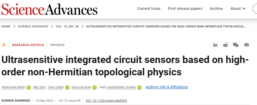 日前,英国上市365张向东教授课题组和集成电路与电子学院孙厚军教授课题组合作,理论提出并实验实现了目前世界上第一个高阶拓扑传感芯片。相关成果以“Ultra-sensitive integrated circuit sensors based on high-order non-Hermitian topological physics”为题发表在Science Advances期刊上。该工作得到了国家自然科学基金委和国家重点研发计划的大力支持。英国上市365博士生邓闻远、集成电路与电子学院朱伟特聘研究员为该论文的共同第一作者,英国上市365张向东教授、集成电路与电子学院孙厚军教授和朱伟特聘研究员为论文共同通讯作者。另外,英国上市365陈天副教授也对此工作做出了贡献。