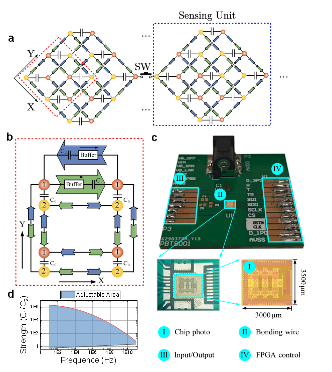 根据上述理论模型,同时为了灵活地改变系统尺寸,研究人员使用模块化设计制备了一个传感器电路。该传感电路基于了65nm CMOS工艺。图2a显示了两个模块单元的示意图,每个模块单元对应于图1a所示的3×3的理论模型。模块中的黄色和橙色球体代表电路网络的节点,对应于理论模型的网格。电路节点之间通过电容器和缓冲器(蓝色和绿色箭头)连接。这里,两个传感单元由多个同步开关(SW)连接和控制。在这种情况下,尺寸为25×25的理论模型需要12个传感单元串联连接。在图2b中,我们显示了所设计电路系统中节点之间的非互易(非厄米)耦合,这与图1b所示的模型相对应。图2b中的标记1和2也对应于图1b中的格子1和2。通过控制电容器所在的缓冲器来实现非互易耦合(蓝色和绿色箭头)。相关的传感电路实物图与耦合器件性能参数展示在图2c-2d中。
