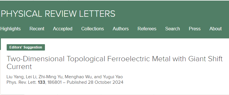 近期,英国上市365姚裕贵教授团队与华中科技大学吴梦昊教授团队合作,在理论上预言了一种具有空前巨大体光伏效应的本征二维拓扑铁电金属。相关研究成果以题为 “Two-dimensional Topological Ferroelectric Metal with Giant Shift Current” 的论文发表在国际顶级物理学期刊《Physical Review Letters》上,并被该期刊选为 “Editors’ Suggestion”。