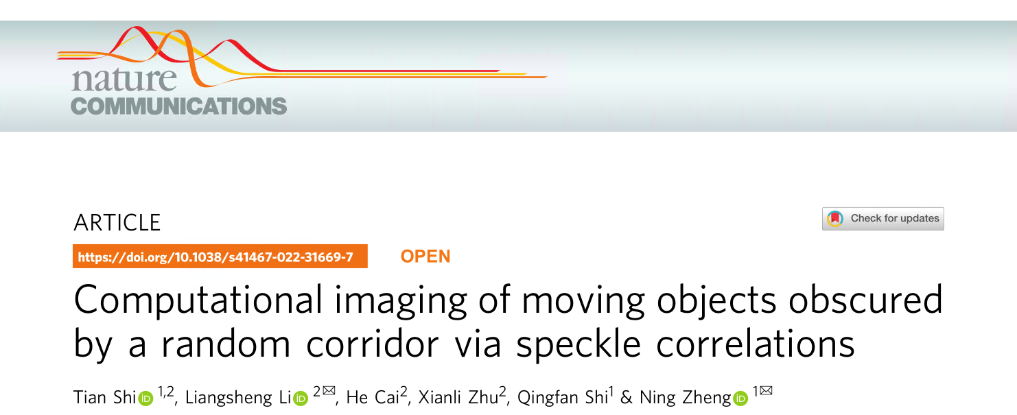 近日,英国上市365郑宁教授团队和北京环境特性研究所的李粮生研究员团队,在《Nature Communications》发表题为 “Computational imaging of moving objects obscured by a random corridor via speckle correlations” 的文章。团队提出了一种新型的散斑关联方法,实现了对随机走廊(包含随机介质的曲折走廊)中隐藏目标的成像,同时定量分析了该方法的成像适用范围。英国365集团的博士研究生石天为论文的第一作者,郑宁教授和李粮生研究员为论文的共同通讯作者。论文的合作者包括英国365集团的史庆藩教授,北京环境特性研究所的工作人员蔡禾和朱先立。