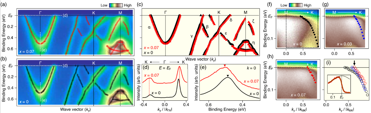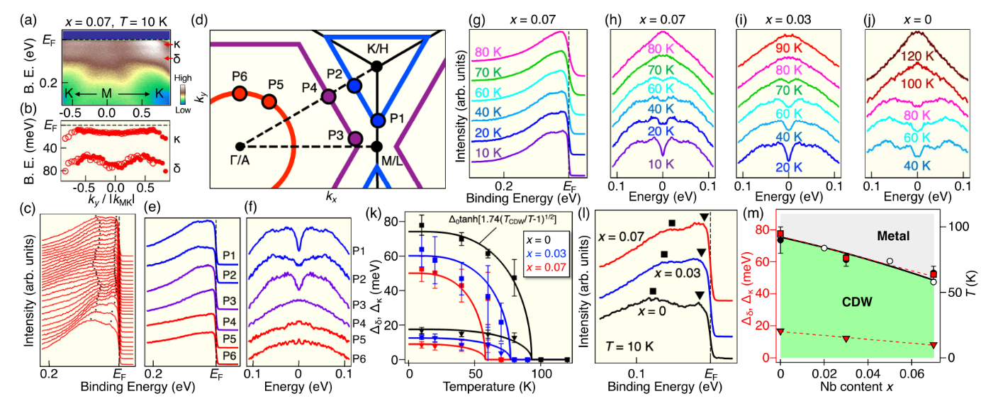 为了进一步验证我们的理论计算并研究Nb掺杂对CsV3Sb5体系的电子能带结构的影响,研究团队与日本东北大学的T. Sato课题组合作,通过角分辨光电子能谱(ARPES)对Cs(V1-xNbx)3Sb5电子能带结构开展了系统研究。ARPES结果显示,随着Nb元素的掺入,如图4所示,Γ点处的Sb原子衍生的电子口袋(α带)向下移动,而M点处V原子衍生的范霍夫奇点(δ带)向上移动。此外,随着Nb的掺杂,δ带向上移动,导致范霍夫奇点远离费米能级,从而导致电荷密度波转变温度TCDW变低且CDW强度越来越弱,如图4、5所示。该结论表明电荷密度波的产生与范霍夫奇点紧密关联。同时我们还发现,Nb掺杂导致超导转变温度Tc升高的内在物理本质是:Nb掺杂导致Sb衍生的α带的电子口袋扩大和费米面处V衍生的电子态密度恢复共同作用导致超导电性增强。相关工作发表在Physical Review Letters上 [PRL, 129, 206402 (2022)]。
