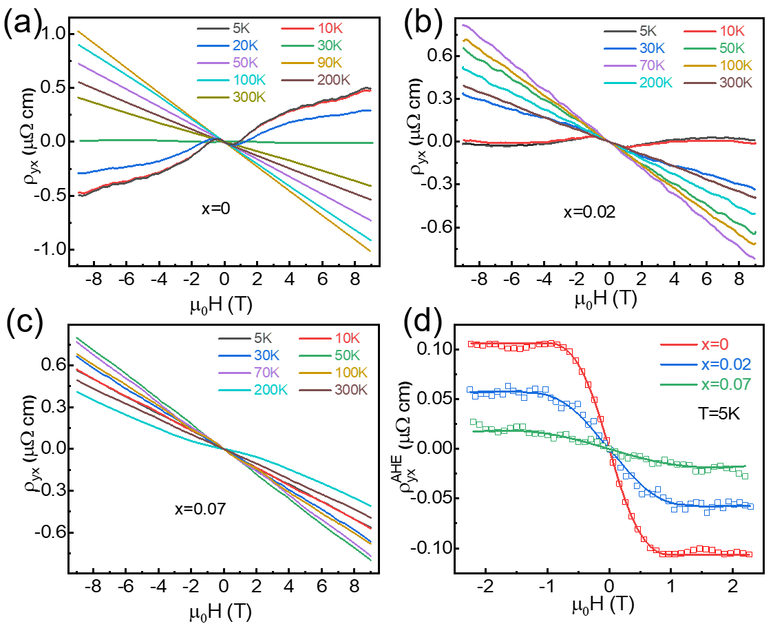 图2. Cs(V1-xNbx)3Sb5中反常霍尔效应随Nb掺杂浓度增加而变弱