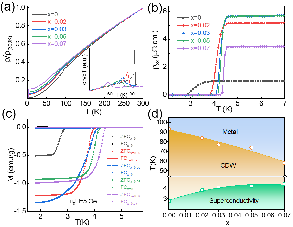 图1. 不同Nb掺杂浓度的Cs(V1-xNbx)3Sb5中的电荷密度波和超导特性