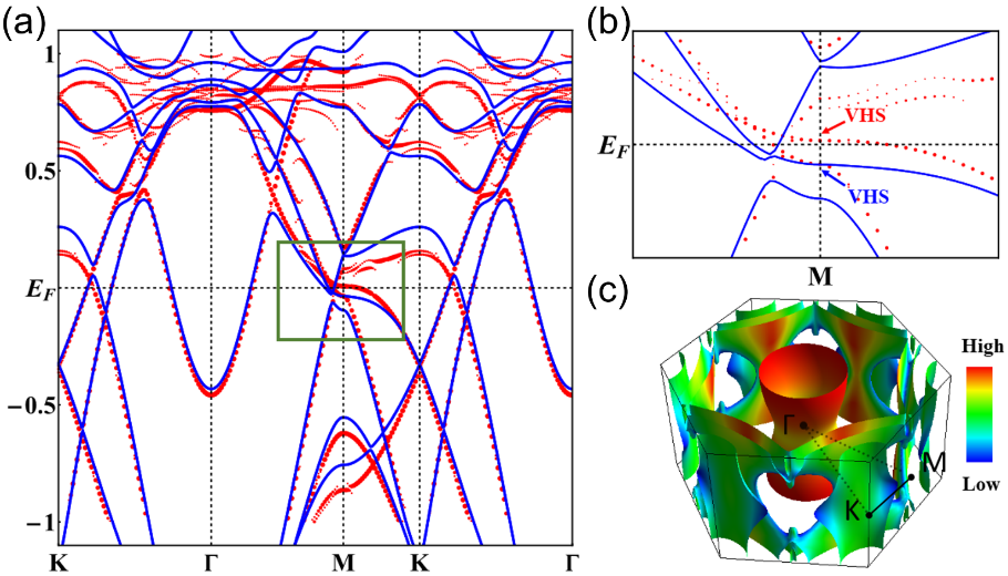 为了解释电荷密度波和超导之间的这种竞争关系,我们进行了第一性原理计算,如图3所示:第一性原理计算结果表明Nb的掺杂使得M处的范霍夫奇点发生了变化,Nb掺杂使范霍夫奇点从低于费米能量移动到高于费米能量,使其被填充的能量态密度被耗尽,因而减弱了电荷密度波;同时,Nb的掺杂使得处的电子口袋扩大,这为超导配对提供了更多的电子态密度,因而提高了超导性,我们结果揭示了Cs(V1-xNbx)3Sb5体系中电荷密度波和超导之间不同寻常的竞争。相关工作得到了南京大学闻海虎教授课题组的合作,成果以Letter的形式发表在Physical Review B上 [PRB 105, L180507 (2022)]。