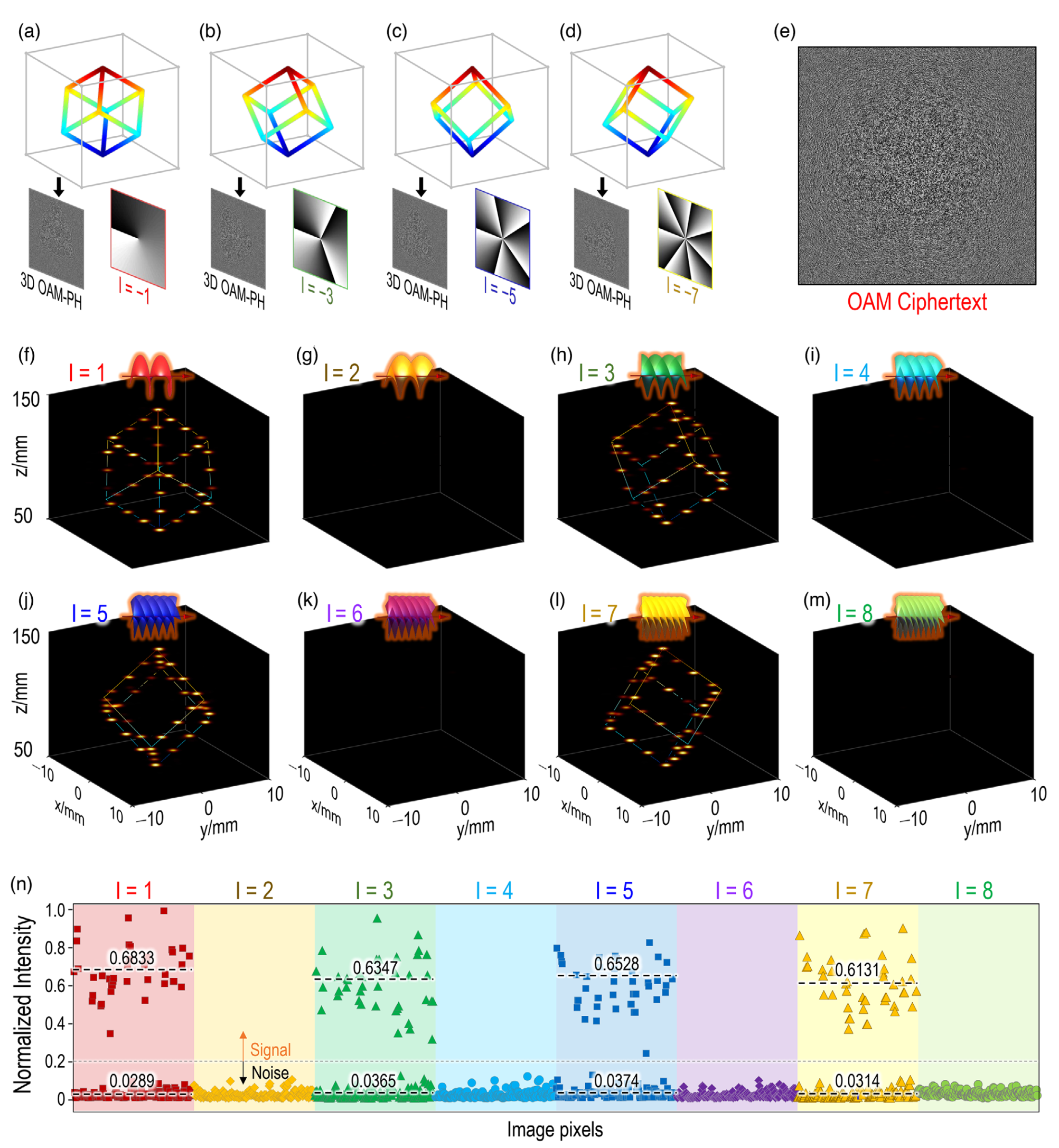 如前文所述,3D OAM复用全息图可以再现多个3D物体的3D全息图像。使用携带有相应的OAM光束作为入射光,就可以重构出3D物体的3D图像。换句话说,如果将多路复用全息图的制备过程看作3D OAM全息的加密过程,那么,3D图像的重建过程就可以被看作解密过程。用于编码的OAM态就是“密钥”。只有事先知道正确的“密钥”,才能重建出想要的3D图像。这样就实现了多个3D物体的全息加密。