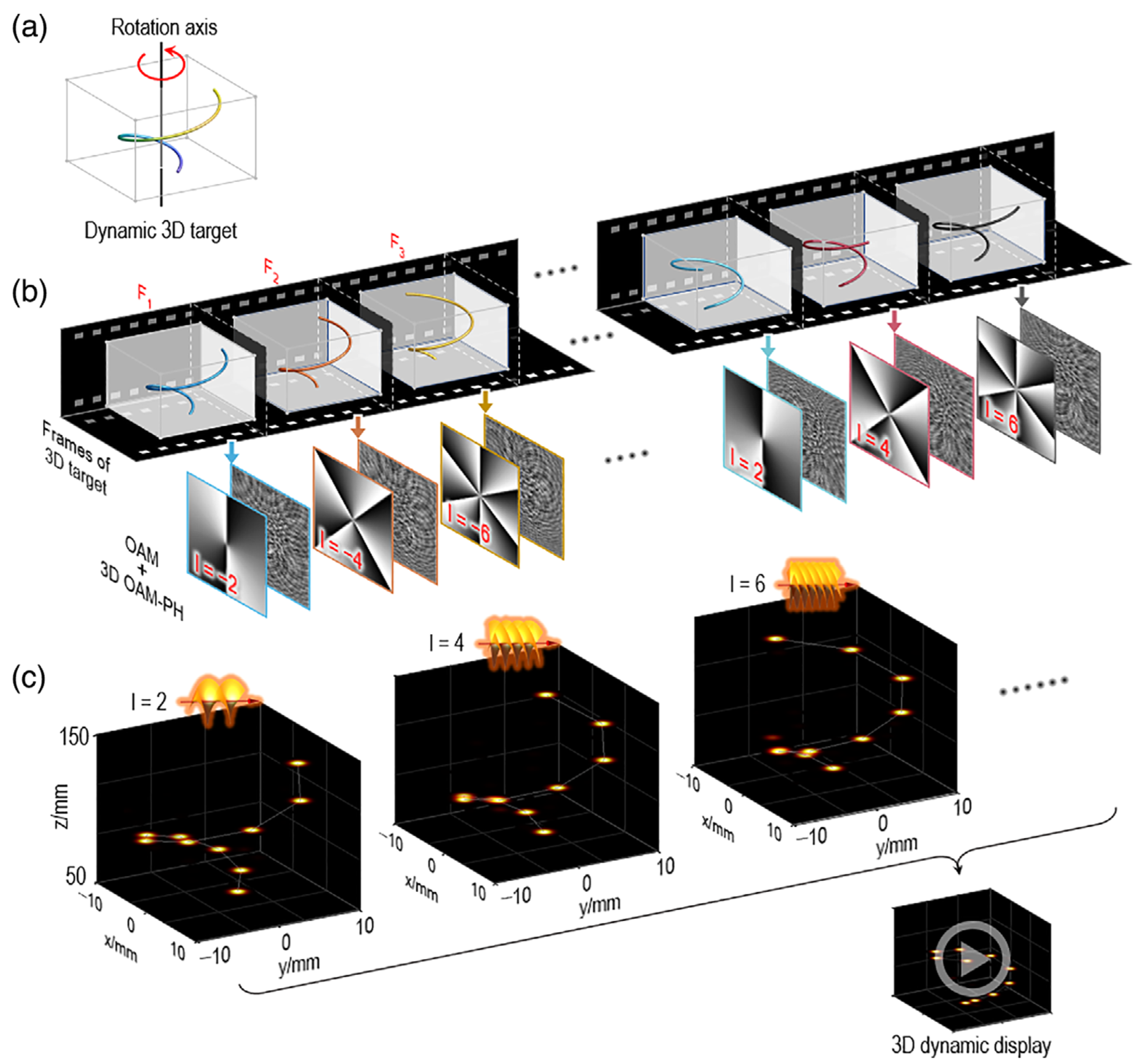 图4. 基于3D OAM复用全息的3D动态显示的设计及其实验结果。