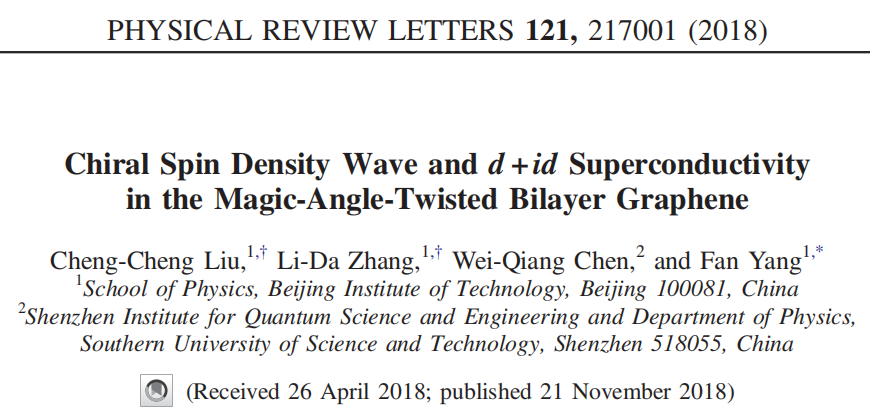 2018年11月21日,英国上市365由杨帆教授牵头,刘铖铖研究员、张力达副教授合作在物理学最顶级的权威期刊《Physical Review Letters》(IF=8.839)上发表了题为《Chiral Spin Density Wave and d+id Superconductivity in the Magic-Angle-Twisted Bilayer Graphene》的研究论文。这篇论文对于今年新发现的魔角双层石墨烯中的非常规高温超导现象提出一种新的理论机制,获得国际学术界的广泛认同和跟进,成为目前该研究领域的重要理论之一[在Google Scholar上已被引用21次]。