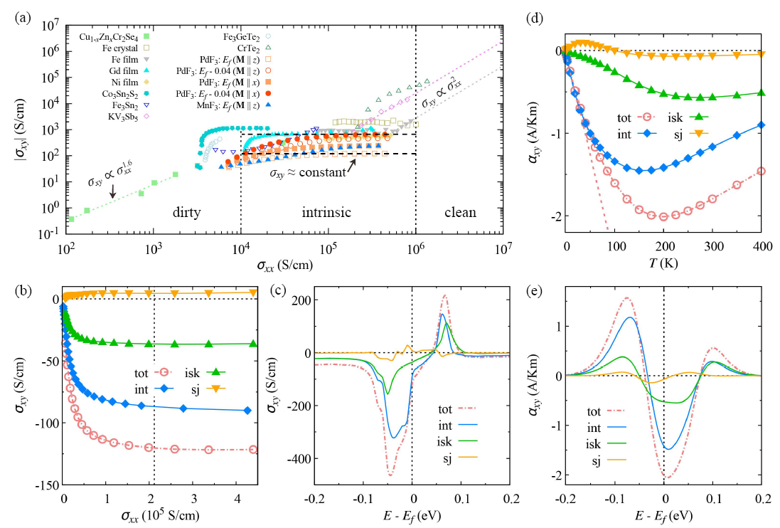 图2:(a-b) 自旋零带隙节线半金属MF3 (M = Pd, Mn)的反常霍尔电导率及其不同物理机制的贡献随着纵向电导率的变化关系;(c) 不同物理机制下的反常霍尔电导率随着费米能级的变化关系;(d-e) 不同物理机制下的反常能斯特电导率随着温度和能量的变化关系。