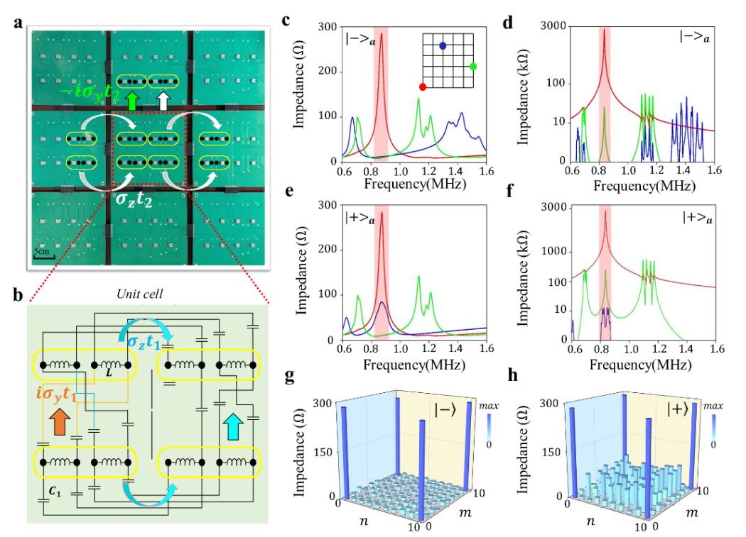 研究人员通过设计拓扑电路来观察非阿贝尔拓扑连续谱束缚态。图2a为电路板样品的照片示意图,不同颜色的箭头表示格点之间的不同耦合矩阵。单个元胞的电路结构示意图如图2b所示。研究人员将具有内部赝自旋的单个子格点映射到黄色框中的四个电路节点,通过阻抗测量可以探究不同子空间的能谱特性,如图2c和2e所示。红色、绿色和蓝色线分别对应角点、边点和体点的阻抗响应。结果表明角点处的阻抗峰值远大于边点和体点,且该峰值频率与非阿贝尔高阶拓扑连续谱束缚态能量完美对应。实验结果与图2d和2f的电路仿真阻抗响应也具有良好的一致性。研究人员进一步测量了两个子空间中拓扑连续谱束缚态对应频率处的电路阻抗分布,如图2g和2h所示。两个子空间的电路阻抗都在四个角点呈现局域化特性。其中一个子空间的体节点也具有明显的阻抗响应,但该子空间的角点阻抗值仍与另一子空间相同,表明平庸体态和拓扑角态的解耦共存现象。实验结果清楚证明了非阿贝尔拓扑连续谱束缚态的存在。