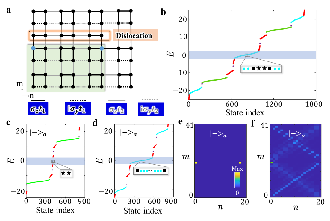除了角点非阿贝尔拓扑连续谱束缚态,研究人员发现在晶格位错缺陷处也存在非阿贝尔拓扑连续谱束缚态。图3a展示非阿贝尔位错晶格模型示意图。图3b为晶格模型本征能谱。图3c和3d显示非阿贝尔本征能谱在两个子空间的分解。其中绿色和蓝色点用于标记不同子空间的体态,红点对应于一维边界态,紫点标记零维局域态。三个插图中的黑色星形和方形非别对应嵌入到零能量周围的缺陷局域本征模式,其空间分布在图3e和3f中展示。结果表明其中一个子空间中的零能量本征态,完美局域在位错位置。但在另一个子空间中的零能态则表现出明显的扩散现象,其源于位错位置对称性的破坏。可以看到,错位缺陷引起的非阿贝尔拓扑连续谱束缚态只能存在于一个子空间。