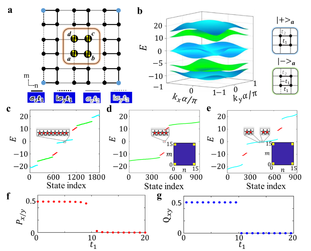 研究人员考虑具有U(2)非阿贝尔规范场的二维晶格模型,其中每个元胞包含四个子格点‘a’, ‘b’, ‘c’, ‘d’,且每个子格点具有一对内部赝自旋|↑>a,b,c,d和|↓>a,b,c,d,如图1a所示。元胞内和元胞间的耦合是通过具有不同耦合系数t1和t2的泡利矩阵σz,σy来实现。泡利矩阵[σz,σy]≠0的不对易性保证了非阿贝尔规范场的存在。图1b展示了非阿贝尔布洛赫能带的计算结果,五条能带由两个正交子空间构成。蓝色和绿色能带分别由一对耦合赝自旋|->d,|+>c,|->b,|+>a和|+>d,|->c,|+>b,|->a形成,其中|±>a,b,c,d=1/√2(|↑>a,b,c,d±|↓>a,b,c,d)是变换后的赝自旋基矢。右侧插图表示两种子空间单独对应的有效晶格模型,其分别可以映射到不同的高阶拓扑晶格模型上。需要强调的是非阿贝尔规范场破坏了系统的U(2)对称性,使得两个赝自旋在任何幺正变换下都无法分离,始终耦合在一起。这一特性是阿贝尔规范场所不具备的,即阿贝尔规范场所引起的内部赝自旋是可以通过幺正变换进行重组并分离的。因此,图1b的每个正交子空间都包含一对耦合的赝自旋,使非阿贝尔规范场诱导的高阶拓扑效应源于内部赝自旋的相互作用。为了探索非阿贝尔拓扑连续谱束缚态的存在,研究员计算了开边界条件下系统的本征能谱,如图1c所示。图1d和1e分别展示两种子空间的能谱,右下角插图呈现了零能局域态的空间分布。结果表明在这两个子空间中,都存在着高阶拓扑角态,同时高阶拓扑角态的本征能量嵌入到平庸体态中,形成非阿贝尔拓扑连续谱束缚态。为了进一步验证非阿贝尔拓扑连续谱束缚态的鲁棒性,研究人员引入两个子空间的耦合相互作用,使得非阿贝尔拓扑模型无法被分解为两个解耦的子空间。通过计算最低能带的Zak相位和第二,三能带的电四极矩可以发现,当包内耦合小于包间耦合时高阶能带拓扑仍然存在。这一现象进一步证明非阿贝尔连续谱束缚态是由两个不可分离的赝自旋相互耦合形成的。