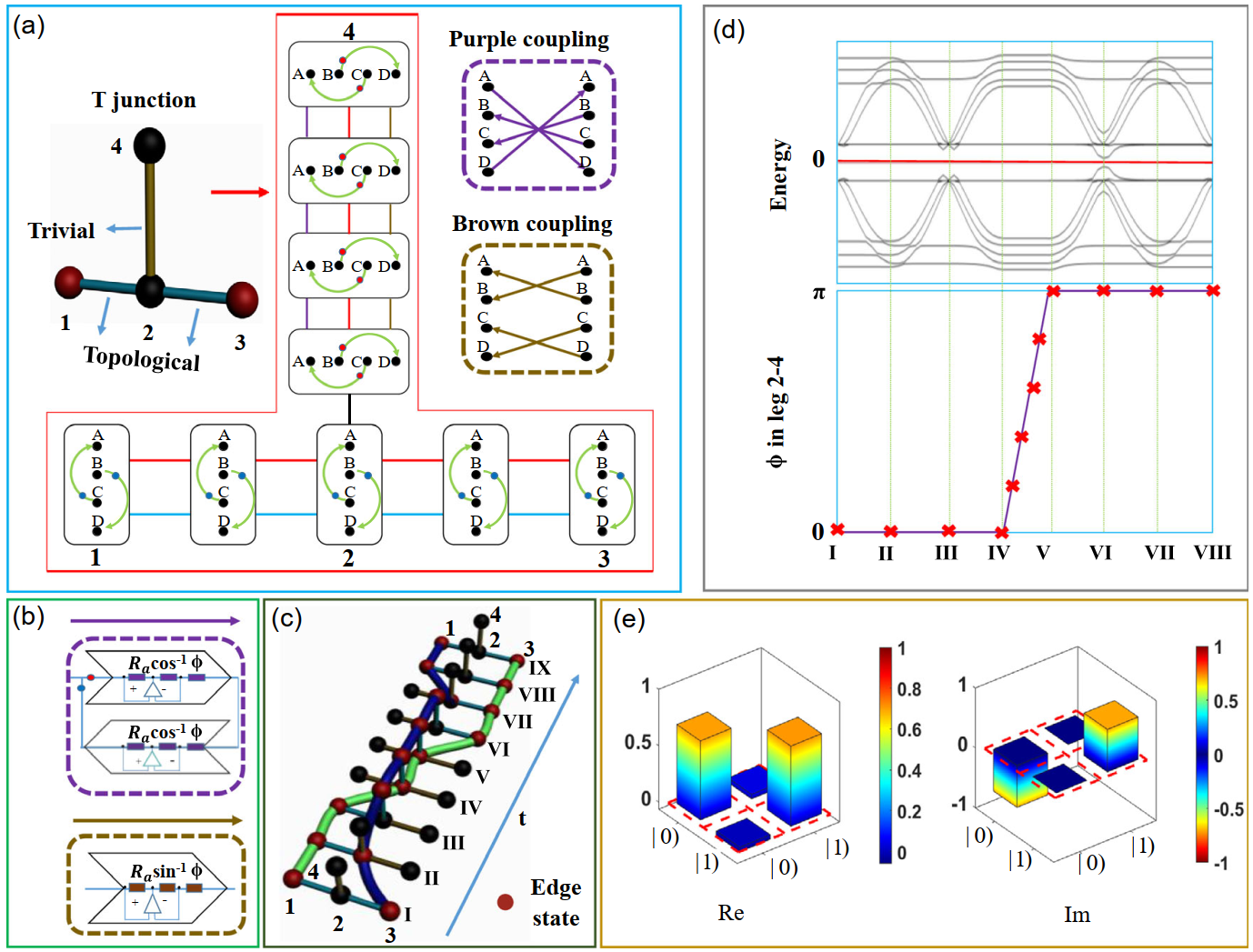 当实现了具有粒子空穴对称性的类马约拉纳零能模后,接下来,研究人员通过调控电路中的开关控制零能模的演化轨迹,进而实现编织操作。在实现控制零能模过程中使用了如图2(a)所示的T结。为了实现编织操作,研究人员将零能模的调控分为8步(见图2(c)):