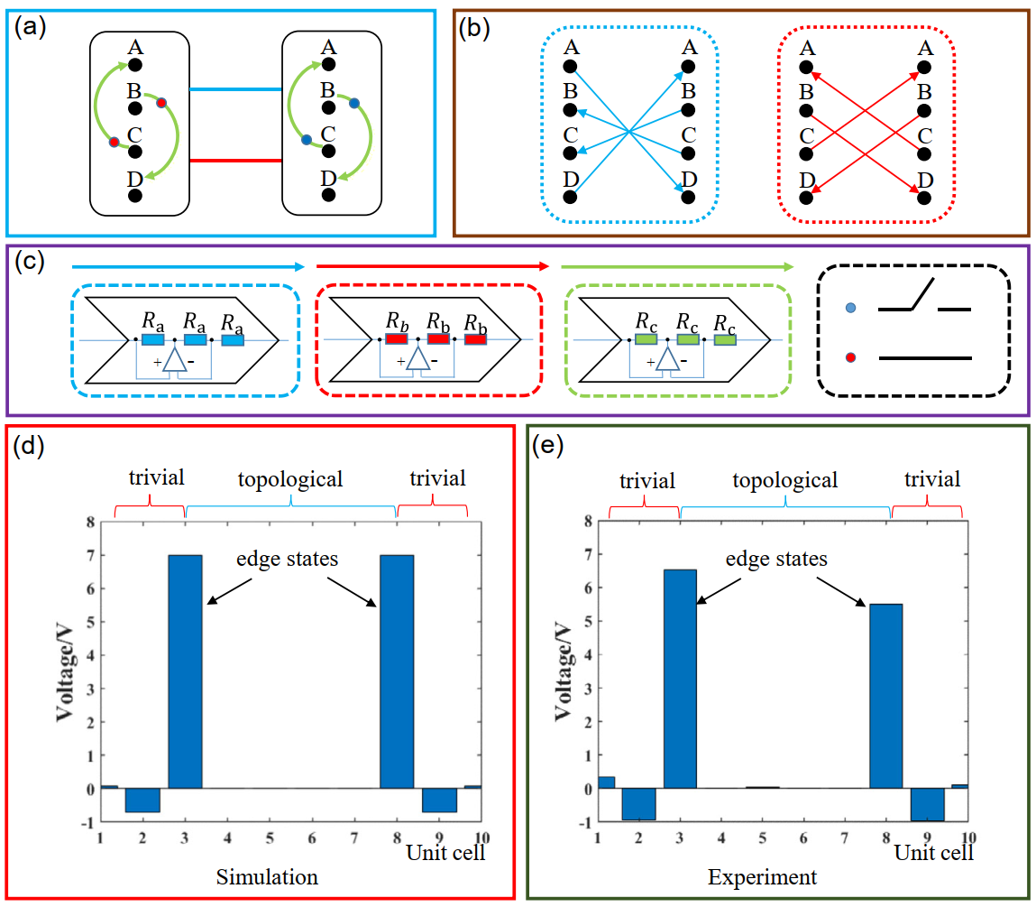 实验中研究人员展示了一个具有10个原胞的电路网络,这些原胞被标记为从1到10,如图1(d)和1(e)所示。在3到8中的所有原胞都为拓扑相,而1到2,以及9到10的单元都为平庸相。当接入外部电源时,电压分布的模拟结果和实验结果分别显示在图1(d)和1(e)中。可以清楚地看到,在拓扑段(原胞3和8)的边缘出现了一对拓扑边缘态。通过比较,研究人员发现实验和模拟结果基本相同。它们之间的差异来自于电路的损耗和元件的误差。