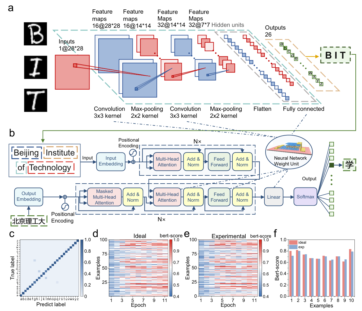 基于CuVP2S6材料的多级电导调控特性,提出了一种类脑神经网络芯片结构,集成了二维突触器件。该芯片通过模拟生物突触权重分布机制,成功实现了跨模态智能处理功能:在光学字符识别任务中,卷积神经网络凭借突触器件的精密权重调节达成高精度识别;在神经机器翻译任务中,Transformer架构利用多级电导态实现翻译质量逼近理想浮点模型,部分样本因动态权重优化表现更优。实验证实,电导多态特性可有效支撑复杂认知任务的硬件级处理,同时光电协同机制为感存算一体架构提供新路径。