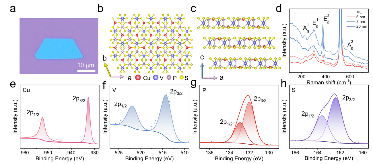 本研究采用空间限域化学气相沉积法(SC-CVD)合成了高质量四元化合物CuVP2S6。通过精确调控前驱体比例、温度梯度与反应时间,抑制了体相晶体生长,成功制备出不同厚度的CuVP2S6薄片(横向尺寸约20 μm)。拉曼光谱确认了晶体的结构特征,X射线衍射(XRD)证实了沿c轴的高结晶度,X射线光电子能谱(XPS)验证了各元素(Cu, V, P, S)的化学态。综合表征结果证实了所合成CuVP2S6样品的高质量。