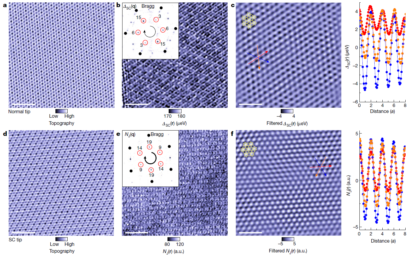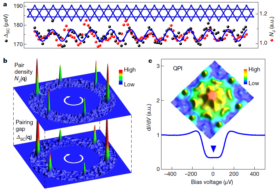 最近,该团队与合作者在AV3Sb5笼目超导体系中发现磁性超导态并发现该超导态可以随磁场调控。使用正常和约瑟夫森扫描隧道显微镜探测到KV3Sb5和CsV3Sb5中的手性超导能隙振荡,振荡周期为2×2,如图1所示;通过施加外磁场,可以调控超导能隙振荡的手性,表明了时间反演对称性破缺的手性配对密度波;进一步用超导针尖实现了超导约瑟夫森结来探测配对密度,并观测配对密度也具有2×2的手性振荡,如图2所示。