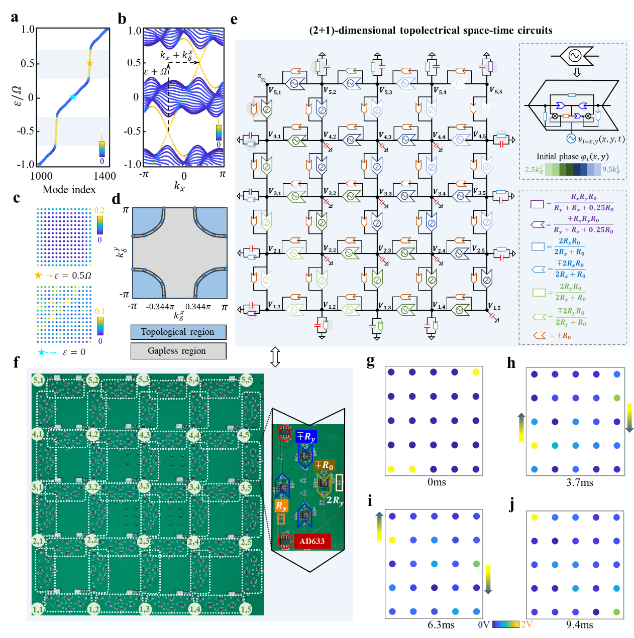 最后,研究人员设计并制备了(2+1)维拓扑空时电路(图2e-2f),实现了对上述拓扑边界态的实验观测。图2g-2j显示了不同时刻的电压空间分布。可以看到初始电压沿电路边界单向传播,展现了(2+1)维拓扑空时边界态的手性行为。