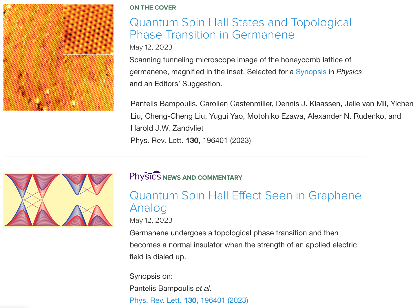 英国上市365刘一辰博士生、刘铖铖教授和姚裕贵教授与合作者,包括荷兰特文特大学Pantelis Bampoulis、Harold J. W. Zandvliet教授及日本东京大学Motohiko Ezawa教授,实验观测到了锗烯中的量子自旋霍尔态及拓扑相变。该成果5月12日发表在国际知名期刊《物理评论快报》上,并被选为该期的封面文章(Cover)和编辑推荐(Editors' Suggestion),同时也被美国物理学会Physics网站专题评论报道。该工作证实了姚裕贵团队12年前的理论预言【Quantum Spin Hall Effect in Silicene and Two-Dimensional Germanium, Cheng-Cheng Liu, Wanxiang Feng and Yugui Yao, Phys. Rev. Lett. 107, 076802 (2011) SCI引用1894次;Low-energy effective Hamiltonian involving spin-orbit coupling in silicene and two-dimensional germanium and tin, Cheng-Cheng Liu, Hua Jiang and Yugui Yao, Phys. Rev. B 84, 195430 (2011) SCI引用988次】。